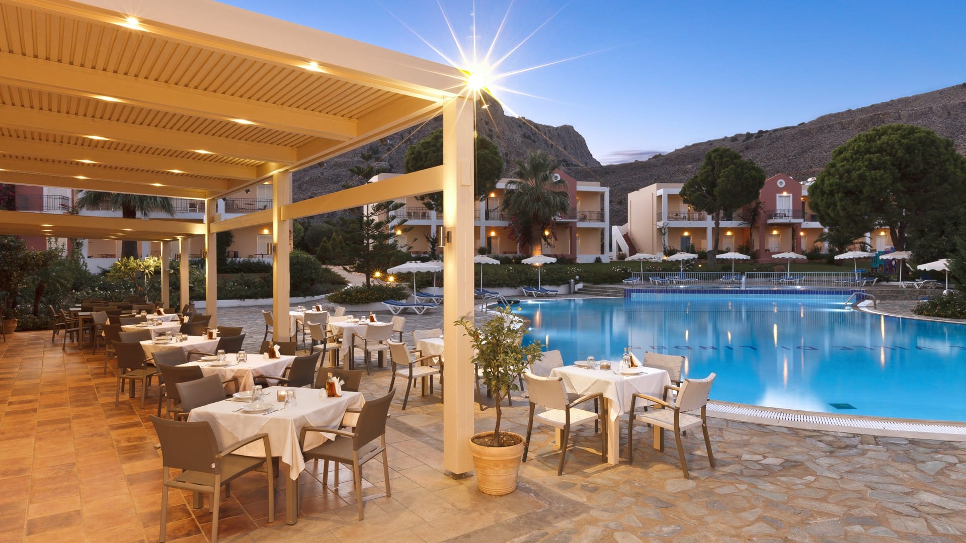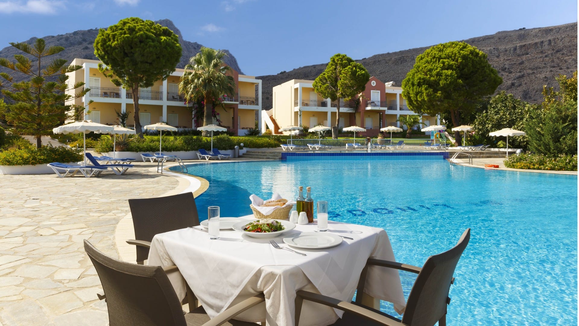 At noon, Greek and foreign music create a romantic atmosphere next to the swimming pool with cocktails and drinks.